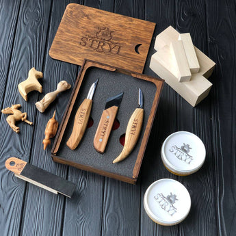 The STRYI 3-Piece Wood Carving Knives Set, elegantly housed in a wooden case, is designed for enthusiasts and professionals alike. Perfect for shaping, whittling, detailing, and creating intricate figurines, these knives excel in crafting and decorating spoon handles, kuksas, and exquisite wooden jewelry.